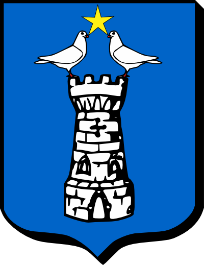 D’azur à une tour crénelée de quatre pièces d’argent, maçonnée de sable, à deux colombes d’argent affrontées, becquées et membrées de gueules, perchées sur les deux créneaux extrêmes, et soutenant de leurs becs une étoile d’or.